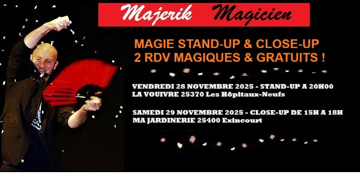 Retrouvez Majerik Votre Magicien pour deux animations gratuites et magiques le vendredi 28 novembre en spectacle de magie et de mentalisme intimiste en soirée et le samedi 29 novembre 2025 en après-midi en close-up en déambulation. STAND-UP & CLOSE-UP – 2 RDV MAGIQUES GRATUITS FIN NOVEMBRE ! VENDREDI 28 NOVEMBRE 2025 – STAND-UP A 20H00 […]