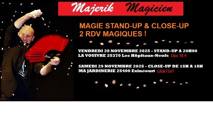 Retrouvez Majerik Votre Magicien pour deux animations magiques le vendredi 28 novembre en spectacle de magie et de mentalisme intimiste en soirée et le samedi 29 novembre 2025 en après-midi en close-up gratuit en déambulation. STAND-UP & CLOSE-UP – 2 RDV MAGIQUES FIN NOVEMBRE ! VENDREDI 28 NOVEMBRE 2025 – STAND-UP A 20H00 – LA […]